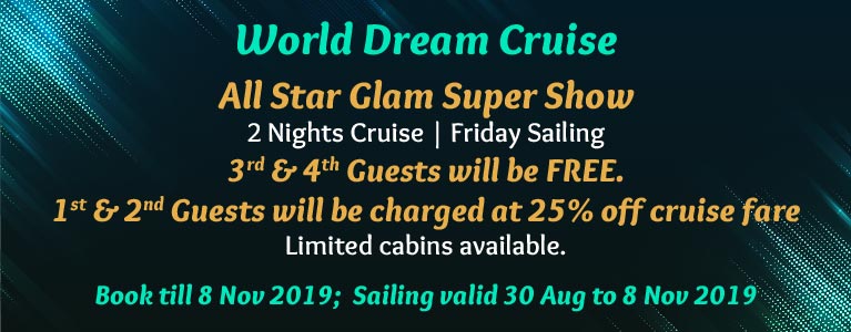 2 Nights World Dream Cruise, Airfare, All Meals on Cruise & All Taxes.
